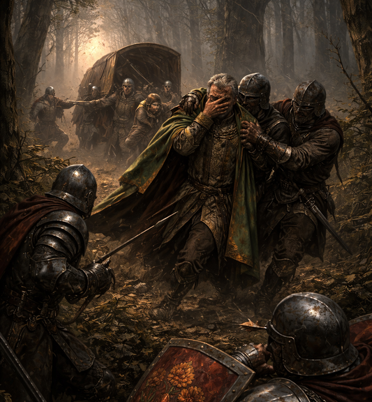 Rankiem wyruszyliście w drogę powrotną do swoich włości. Orszak był niewielki. Kilku ludzi zbrojnych, dwa wozy i wasz ojciec jadący na przedzie. Droga prowadziła przez lasy i pagórki, gdzie rzadko spotyka się podróżnych. Napad nastąpił nagle.Koń jednego z ludzi potknął się o linę napiętą między drzewami. Z lasu posypały się strzały. Dwóch strażników padło od razu. Trzeci zdążył tylko krzyknąć ostrzeżenie. Napastnicy byli szybcy i dobrze przygotowani. Twarze mieli zakryte, a na płaszczach nie było żadnych barw.Nie przyszli po łupy. Przyszli po waszego ojca. W zamieszaniu kilku z nich dopadło go przy koniu. Jeden uderzył go obuchem w głowę. Drugi ściągnął z siodła i związał. Zanim reszta straży zdołała się przebić przez napastników, porywacze zniknęli między drzewami. Zabrali go żywego. Na drodze zostało tylko błoto, krew i ciała ludzi, którzy próbowali go bronić.